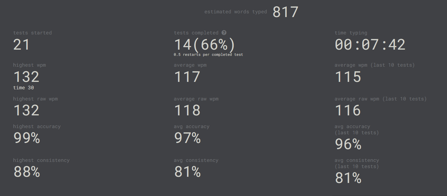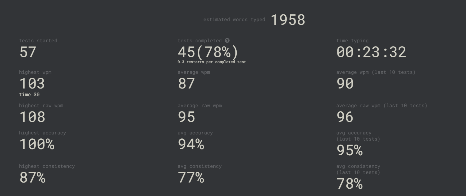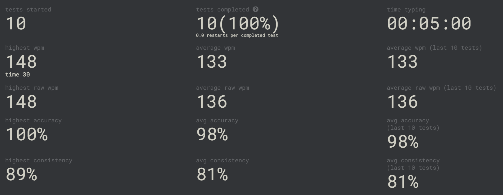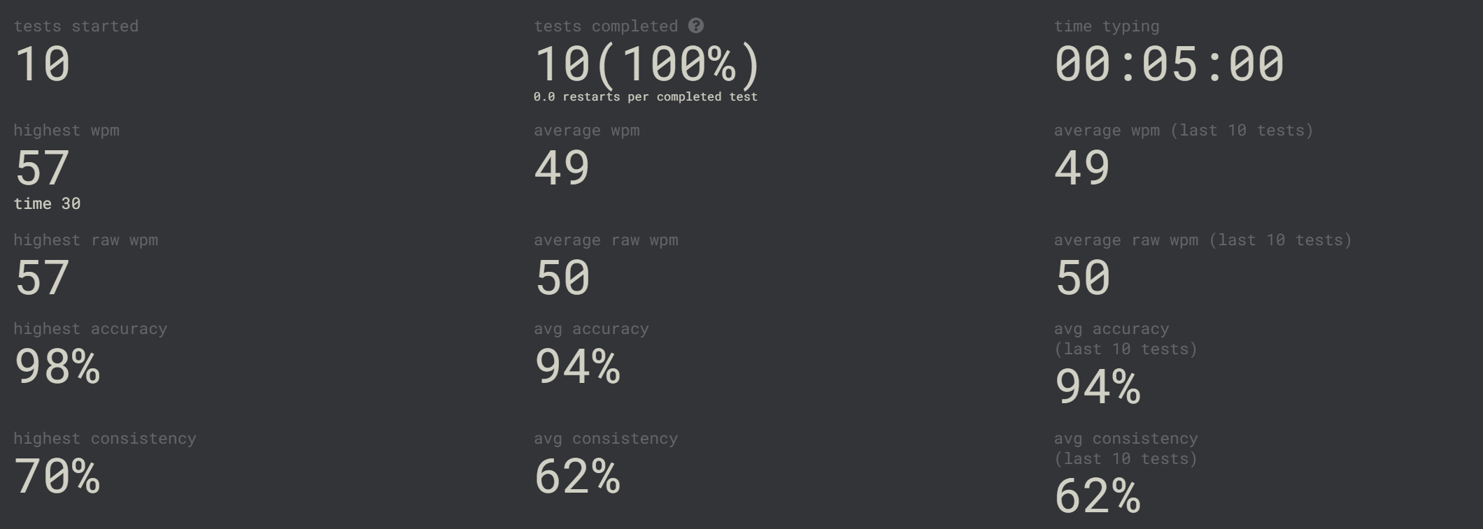We’ll be using monkeytype.com again for consistency (thanks to everyone who suggested it last time!). To qualify, you’ll need to complete at least 10 tests of 30 seconds.
