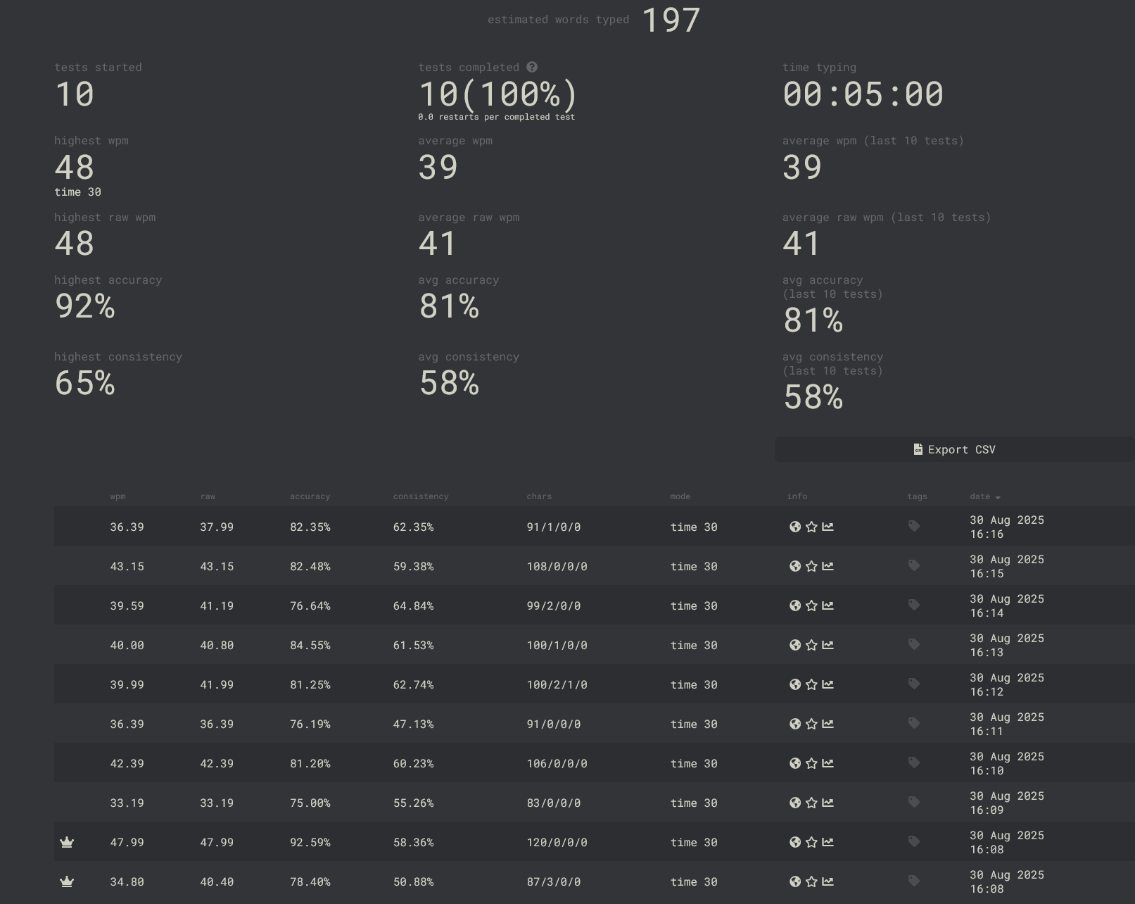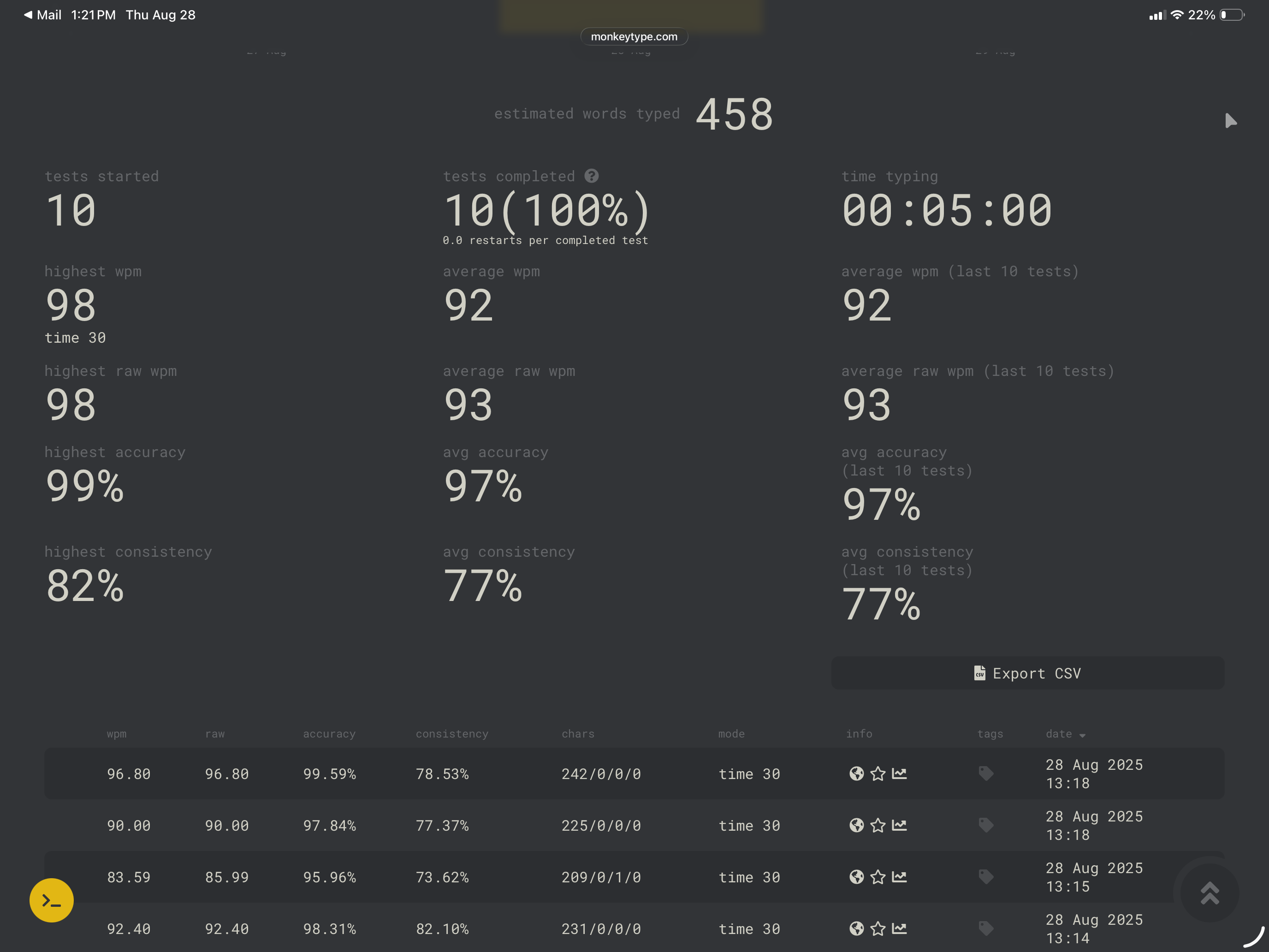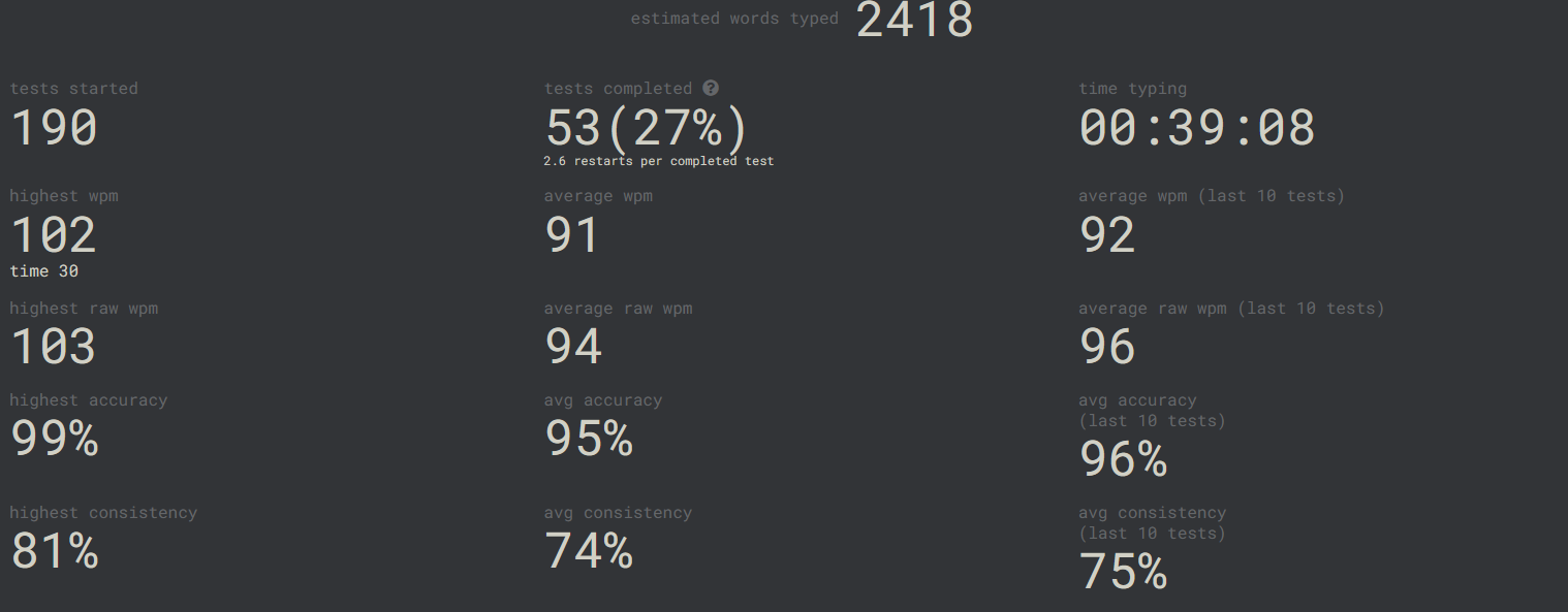 We’ll be using monkeytype.com again for consistency (thanks to everyone who suggested it last time!). To qualify, you’ll need to complete at least 10 tests of 30 seconds.