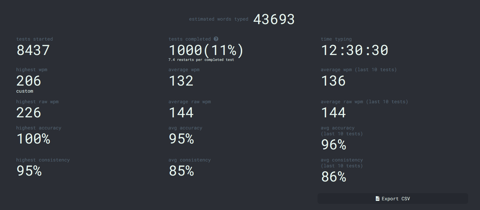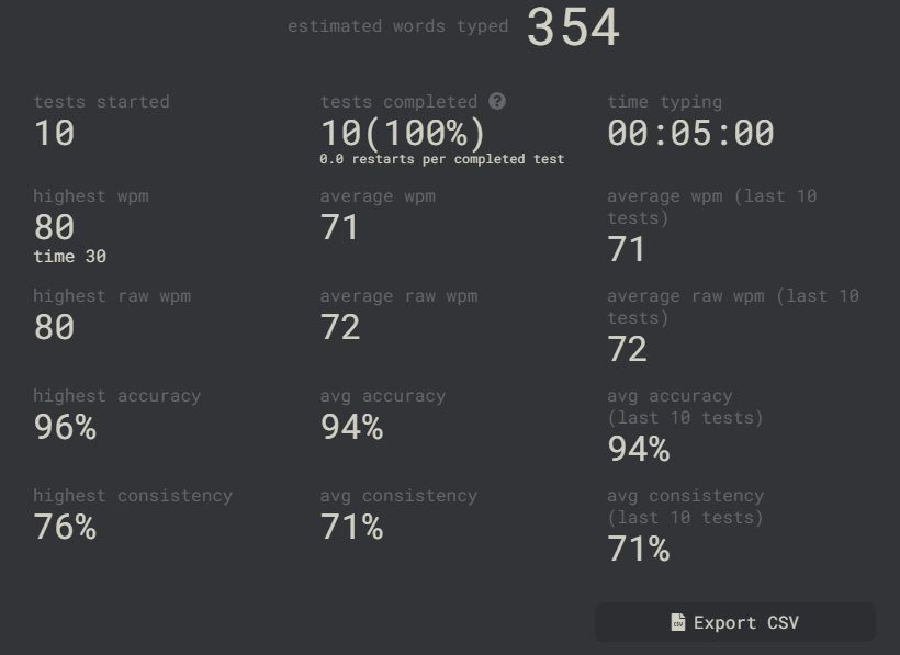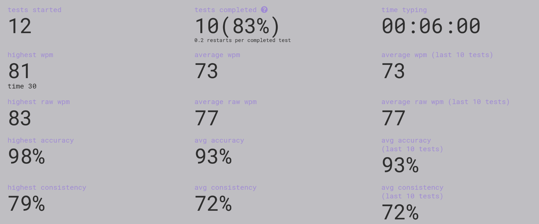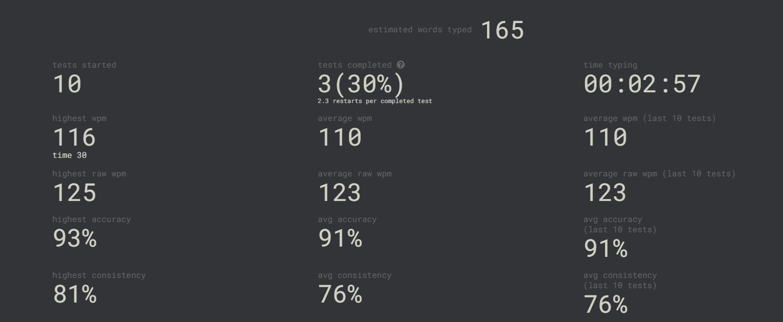 Just a heads up @dylanli3903 you’ll need to complete 10 tests to compete for best words per minute or best accuracy. From this screenshot it looks like so far only 3 tests have been completed.