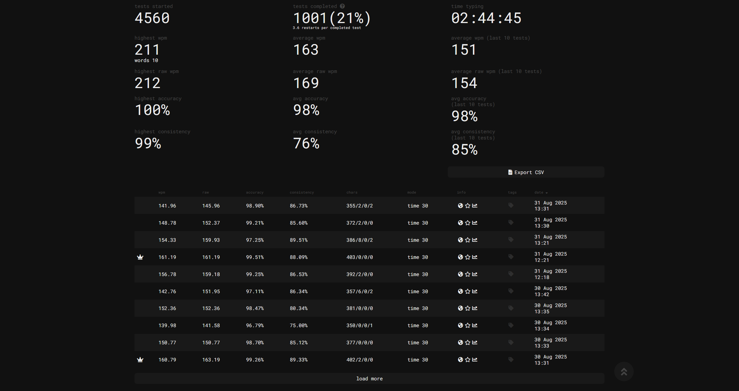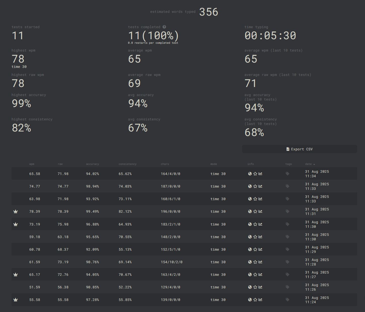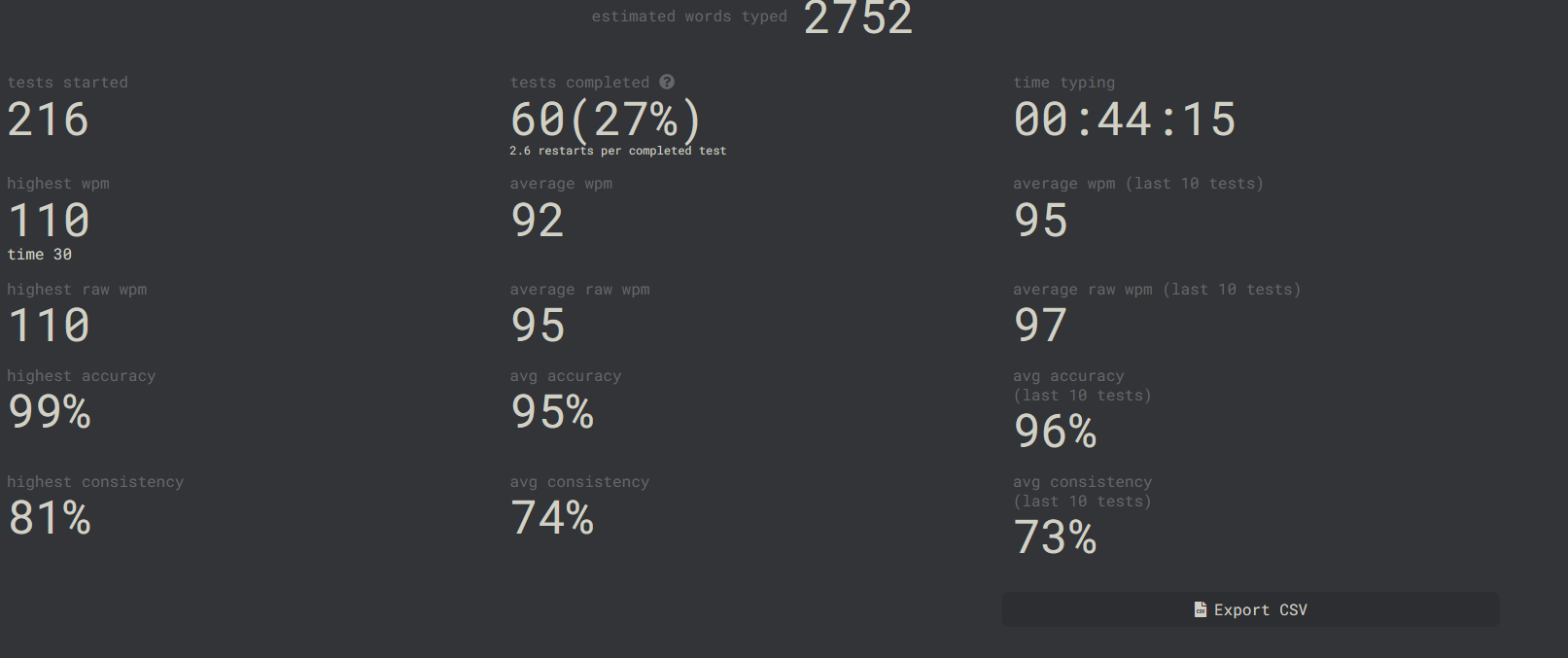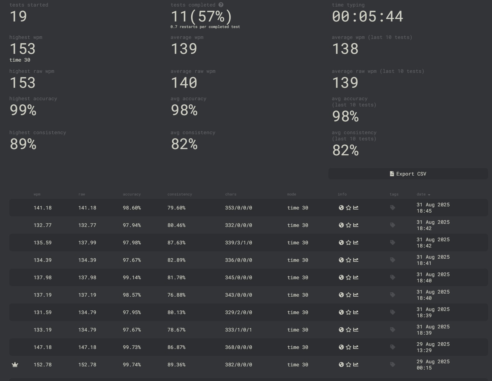 You writing anything from 2.5 to 3 words a second with 99% consistency, yeah whatever buddy. There’s a reason to why all your tests is private on monkeytype