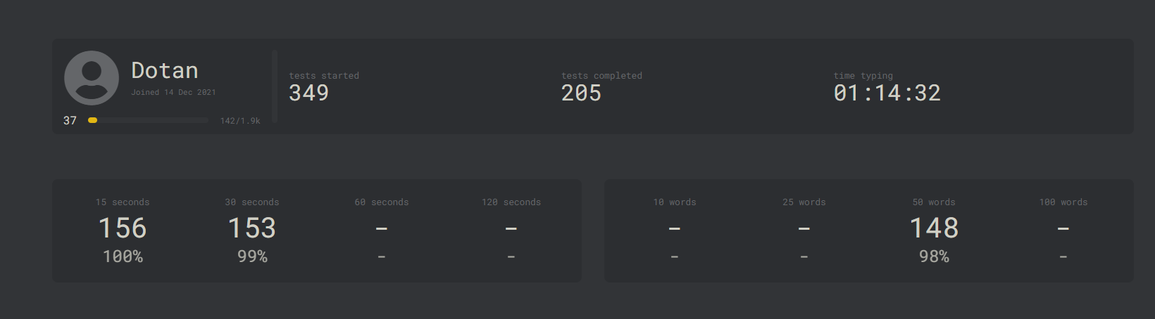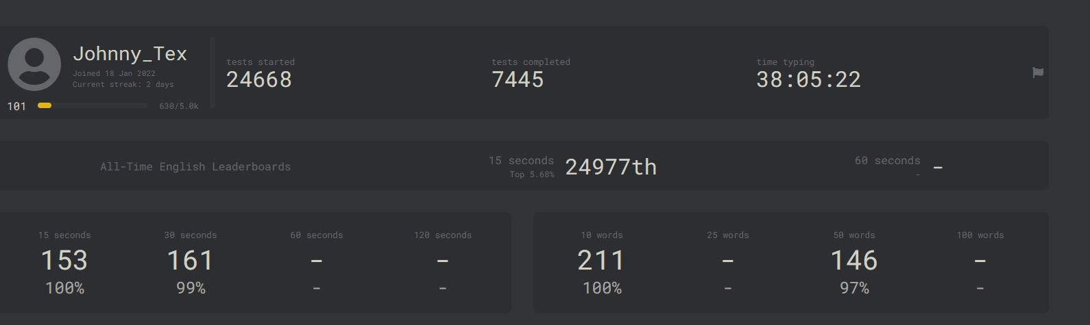 This made me laugh so, so hard. Do you expect people to live their lives around going to Monkeytype every day? My streak capped at 27 when I went on vacation - were you expecting me to keep it going during my time away from everything? Sure, I find it a little odd to have no 60 second test results, but to accuse someone of cheating for typing faster than you…