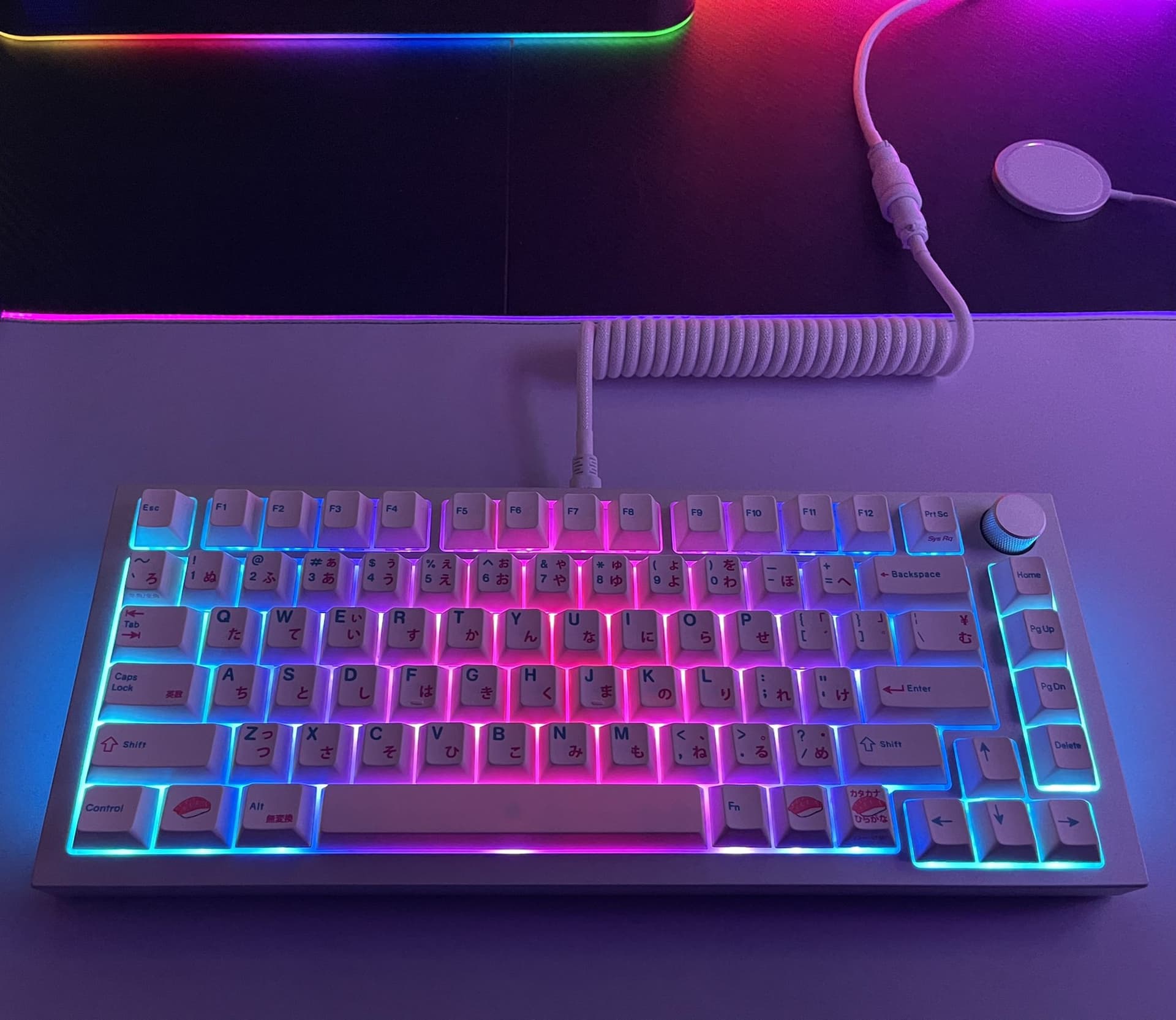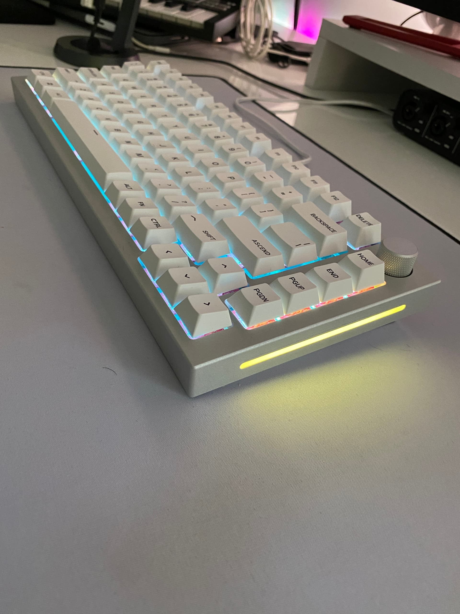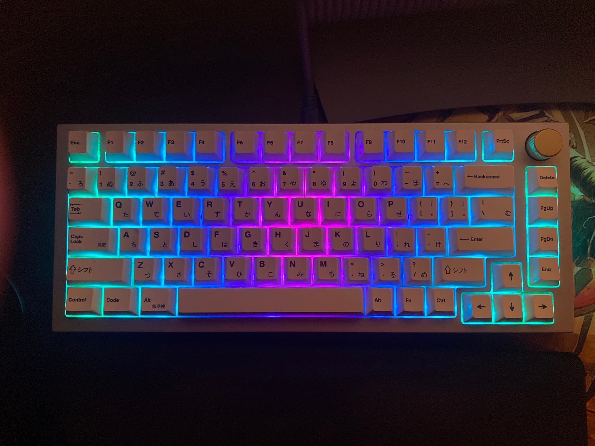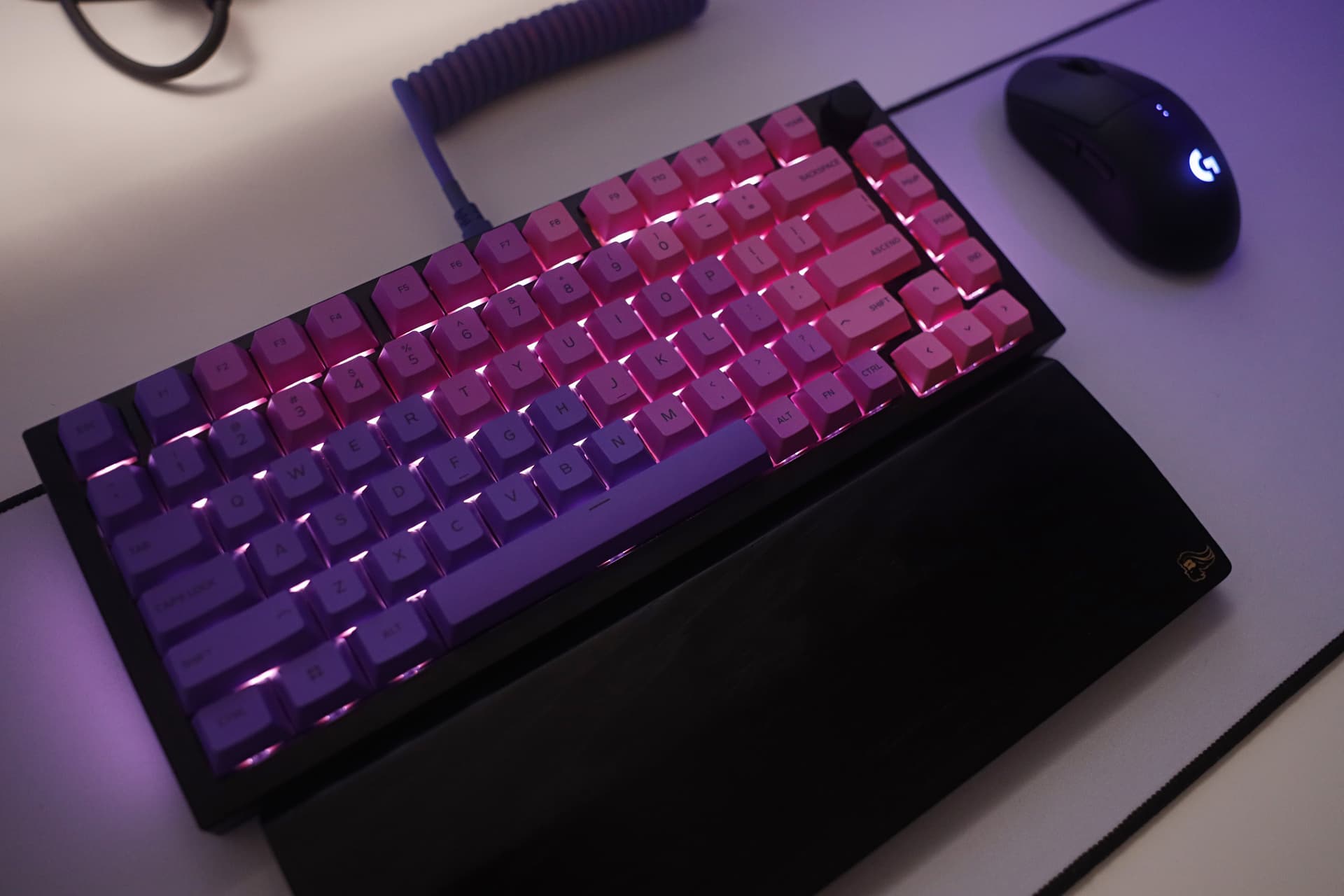 My Gmmk Pro with poly back plate, Everglide aqua king switches, durock v2 stabs, and Drop artifact bloom series glow keycaps(Space bar is from the glorious pudding caps). result is an insanely quiet board with a fantastic rgb effect. wrist rest was a quick 3d print i whipped up one night. i need to take an updated picture since i have a stone wrist rest now! .